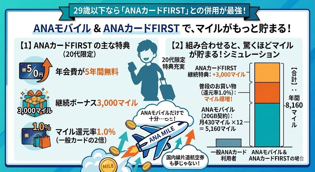 ANAモバイルだけでも十分に魅力的ですが、もしあなたが18歳から29歳(社会人)であれば、クレジットカード「ANA JCB CARD FIRST」を併用することを強くおすすめします。